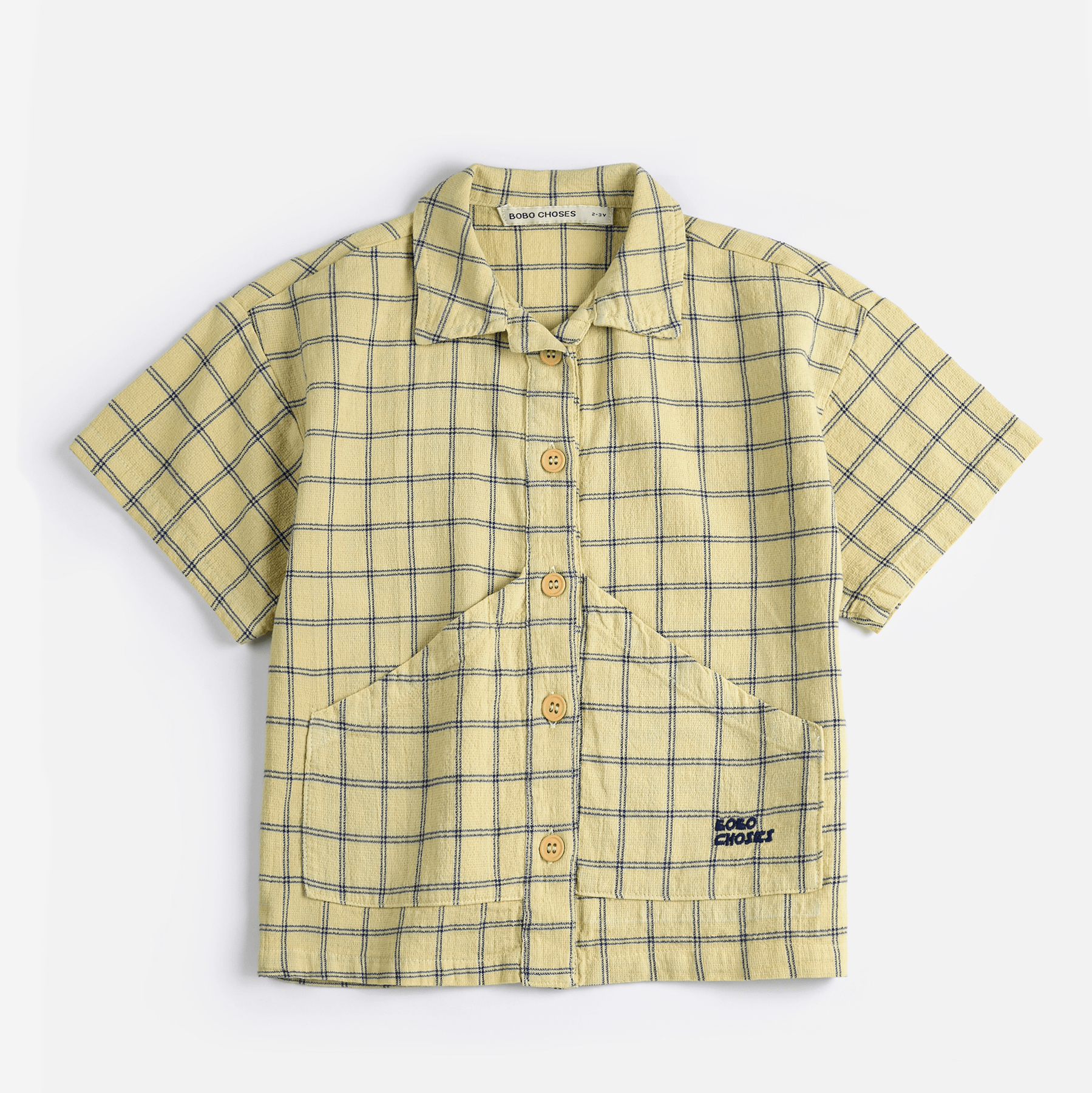 This Bobo Choses grid-print shirt features a classic yellow and navy windowpane pattern in a relaxed, boxy fit. It is designed with a traditional notched collar, wood-toned buttons, and unique angled front patch pockets for a modern, utilitarian touch. Crafted from a textured, breathable fabric, it includes a signature embroidered logo on the pocket, making it a stylish and airy choice for summer.