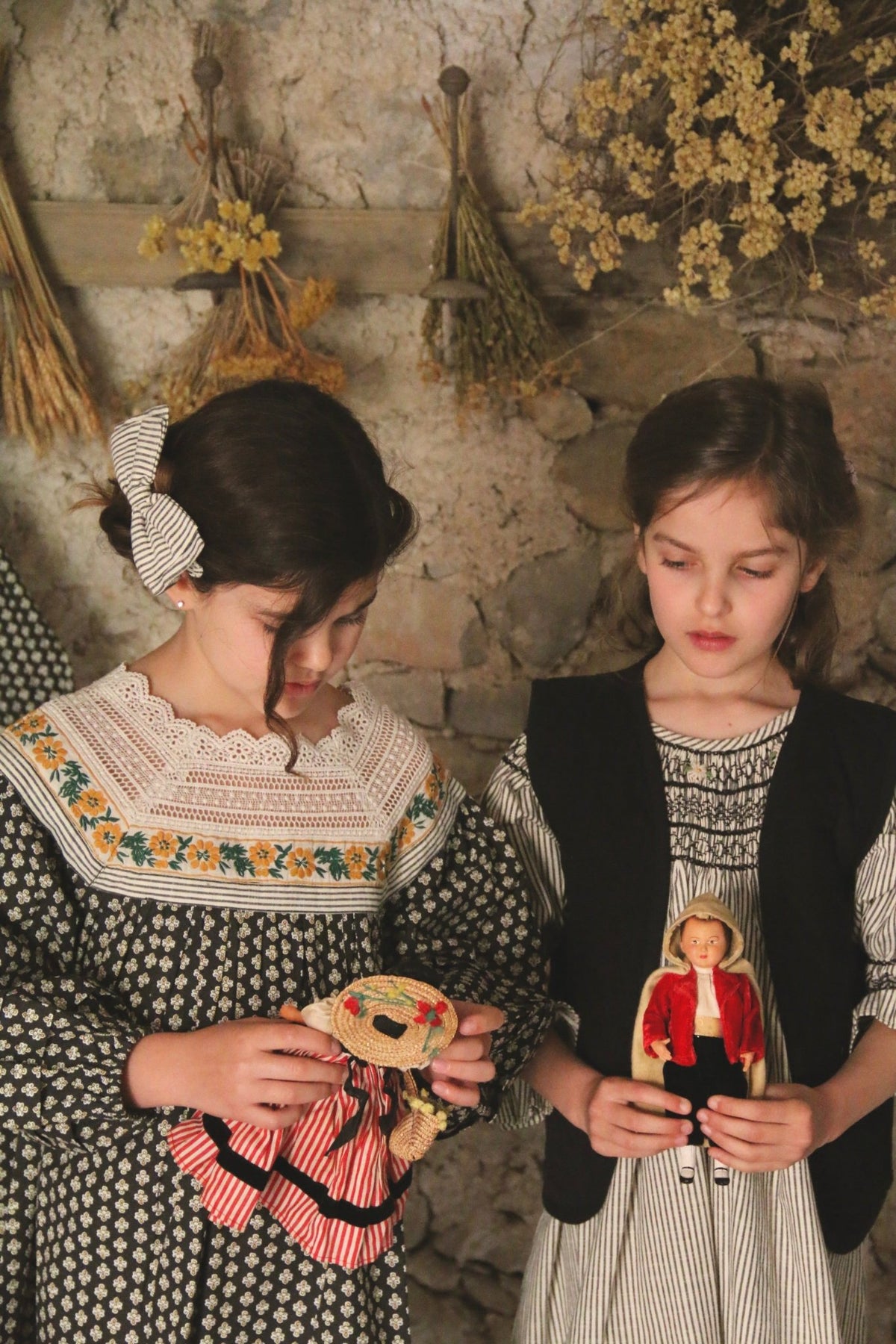 This charming Provençal Print Tunic Dress features a dark base covered in a dense, traditional floral or geometric print, capturing rustic French elegance. The square yoke is the focal point, adorned with a delicate white lace collar layered over a panel of tiny yellow and green floral embroidery. With a comfortable, gathered silhouette and three-quarter puff sleeves, this dress is a sophisticated piece defined by its unique print and handcrafted detail.