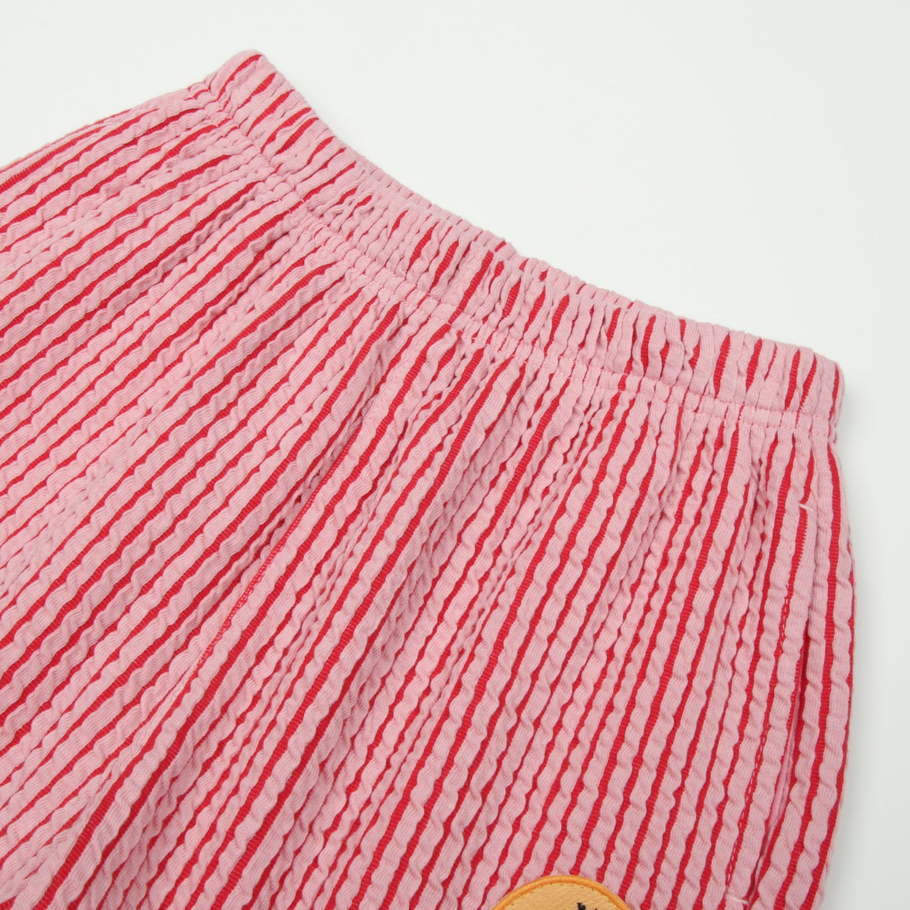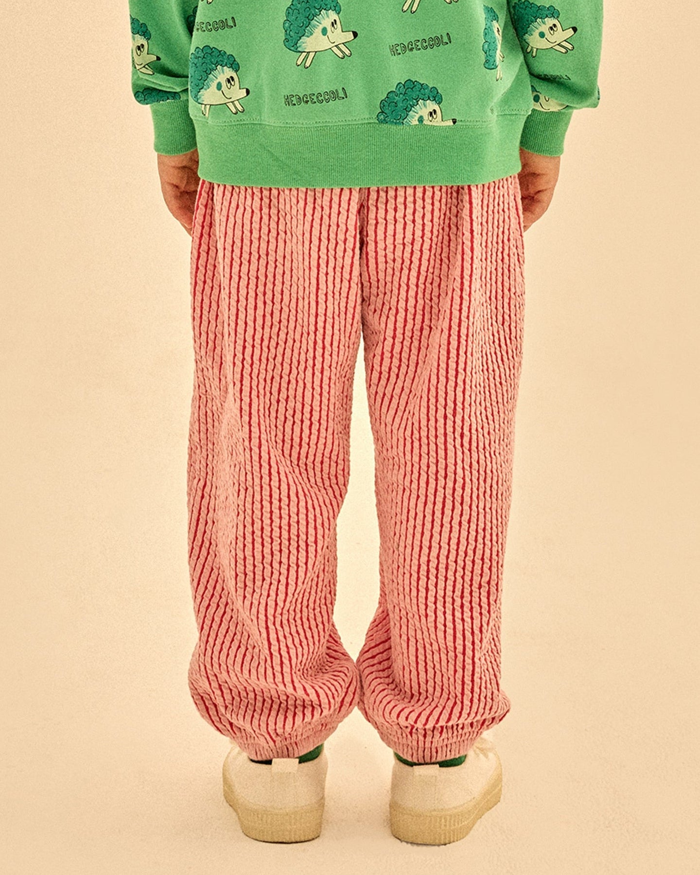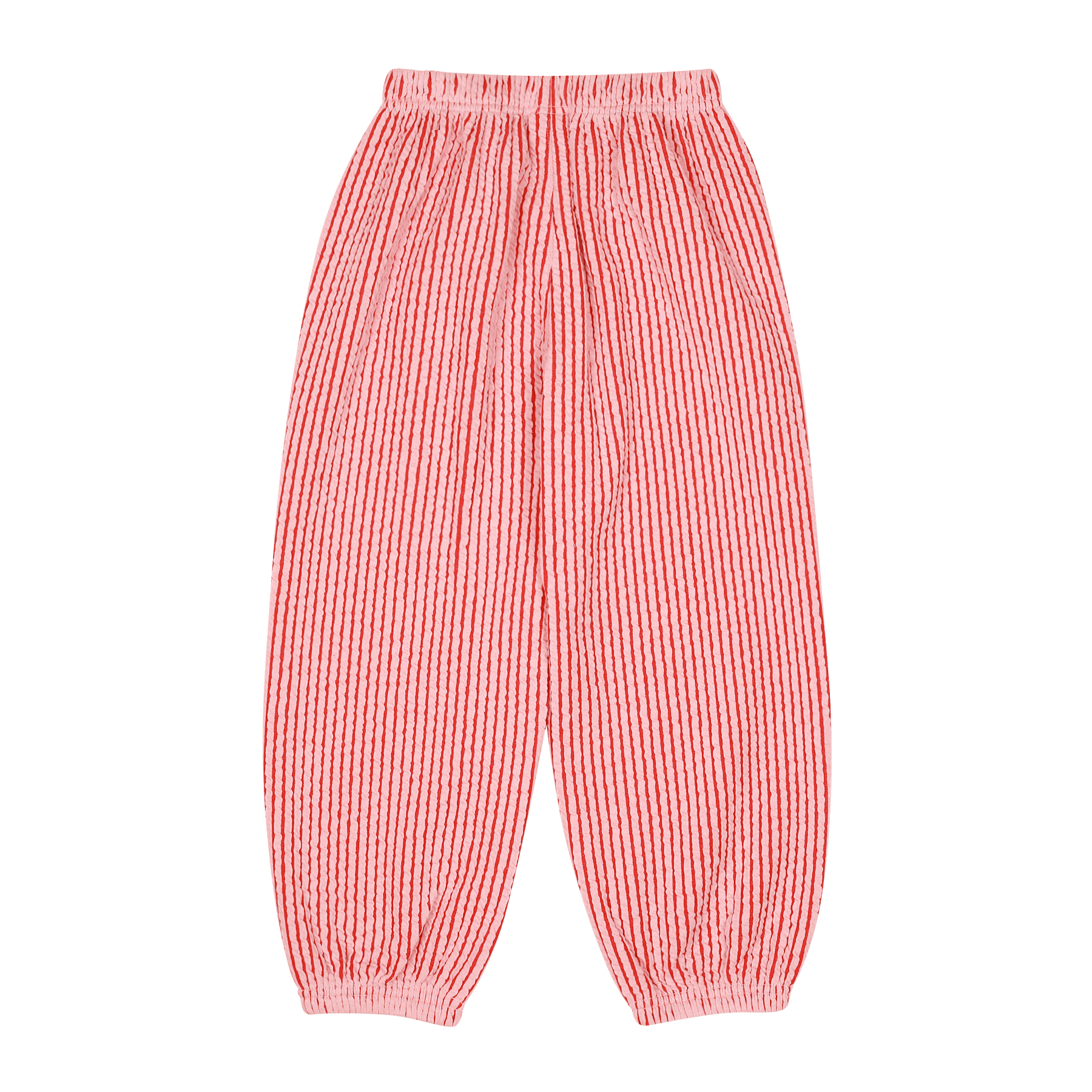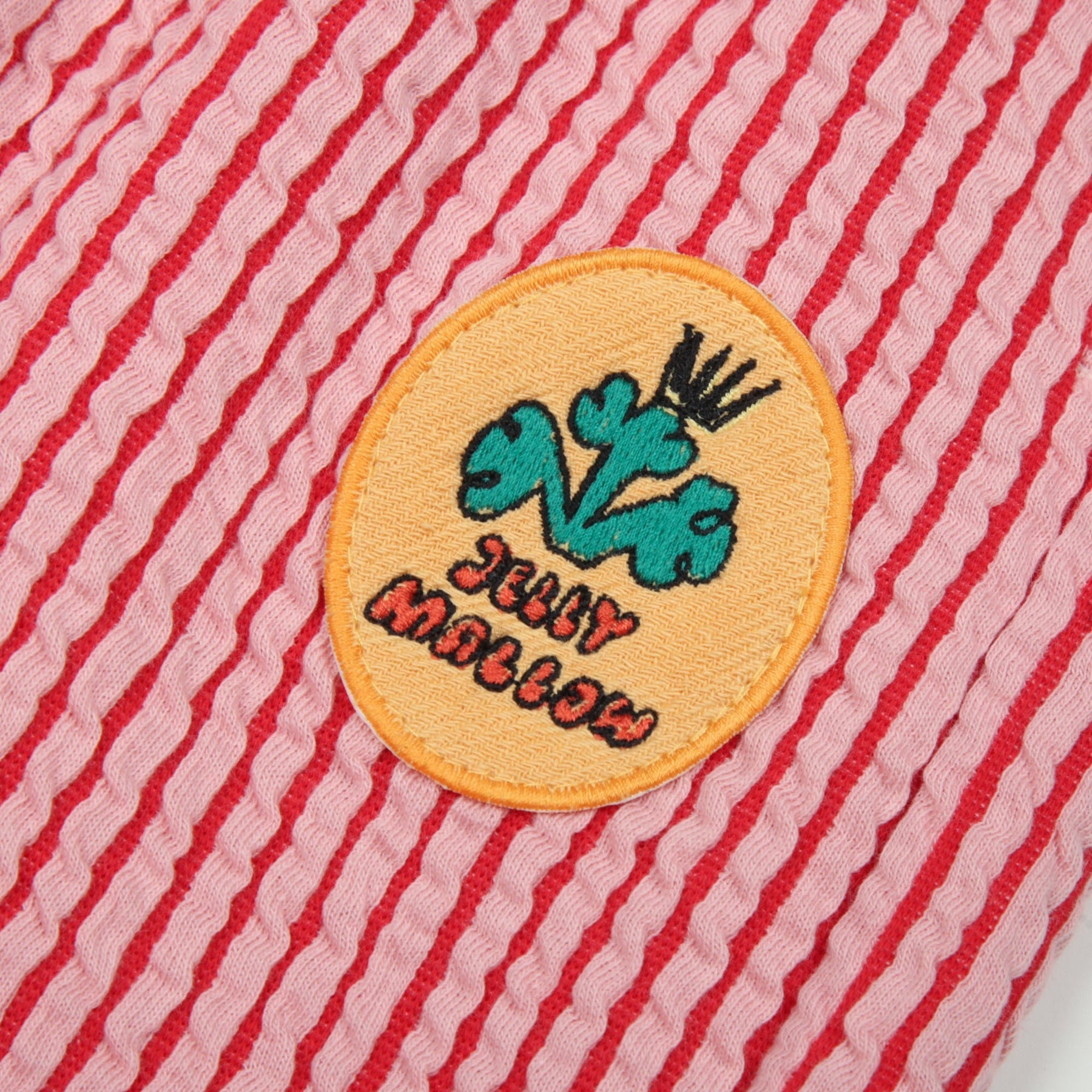 These Jelly Mallow Aladdin pants feature a vibrant red and pink vertical stripe pattern, perfect for adding a pop of colour to their casual wardrobe. Designed with a voluminous leg and elasticated cuffs, they offer a comfortable relaxed fit that allows for plenty of movement during play. The front is finished with a yellow circular patch featuring a quirky green character and "Jelly Mallow" branding, while the elasticated waistband ensures a secure and easy fit.