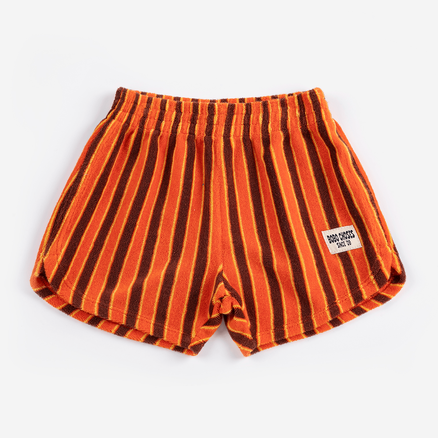 Stay cosy and stylish with these Bobo Choses terry cloth shorts, designed with a vibrant orange, brown, and yellow vertical stripe pattern. Crafted from plush, absorbent terry fabric, these shorts are perfect for beach days, poolside lounging, or post-bath comfort. They feature an easy-on elasticated waistband for a flexible fit and are finished with a vintage-style branded patch on the leg that reads "Bobo Choses Since 09."