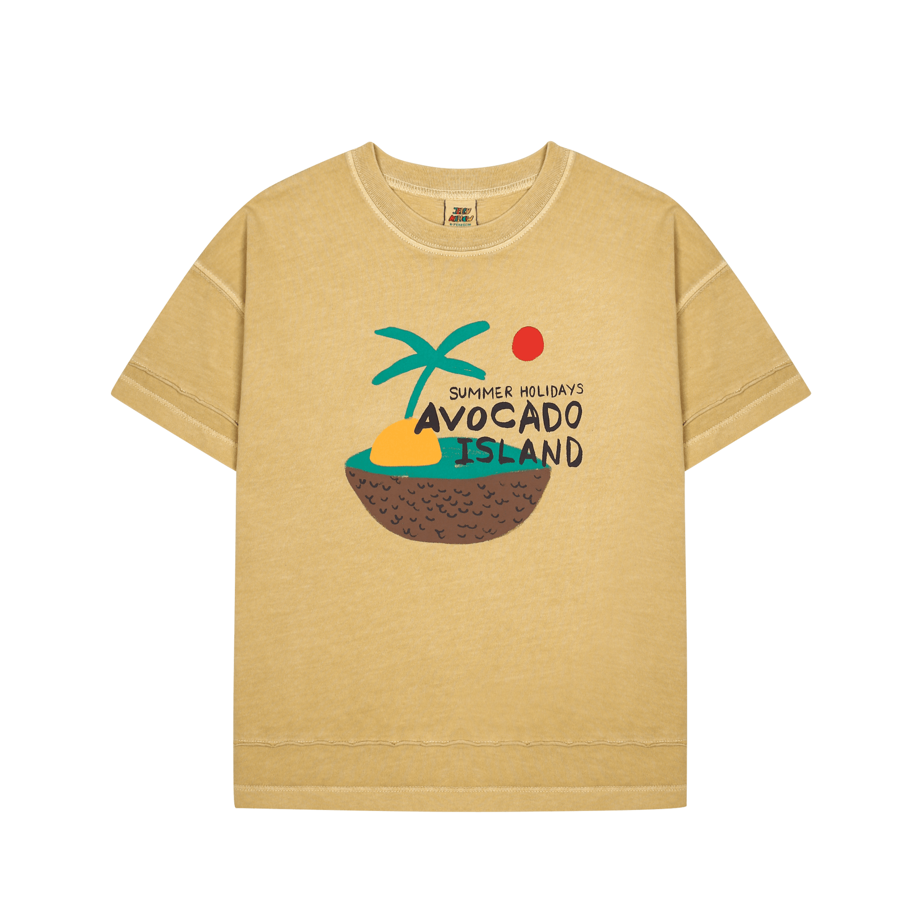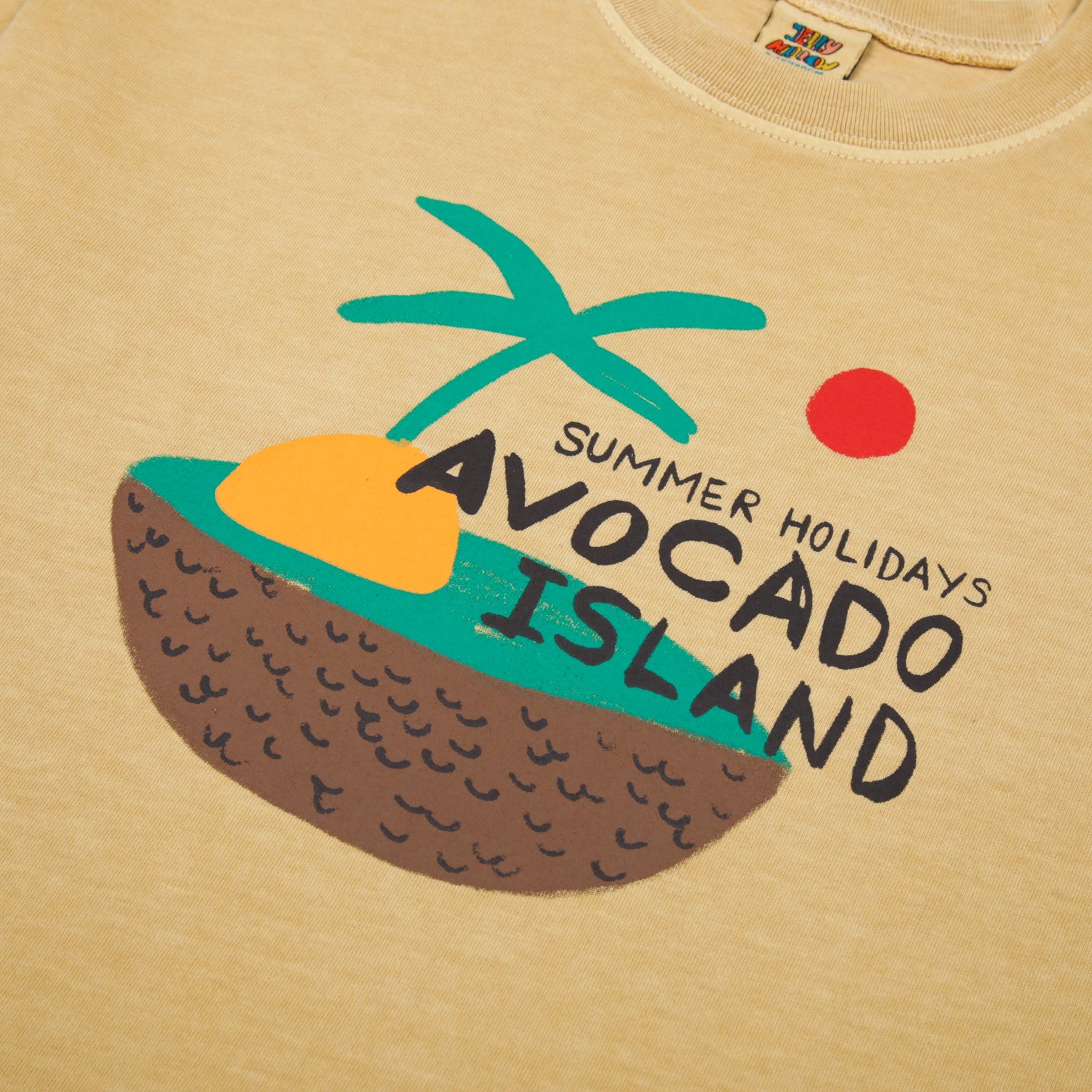 This Jelly Mallow tee captures the essence of a tropical getaway with its "Avocado Island" graphic, featuring a sun-soaked palm tree and a halved avocado island. The shirt is crafted in a warm, sandy beige tone with a vintage-inspired wash that gives it a soft, lived-in feel. Designed with a relaxed fit and dropped shoulders, this comfortable crew neck is the perfect casual piece for keeping cool during their next summer holiday.
