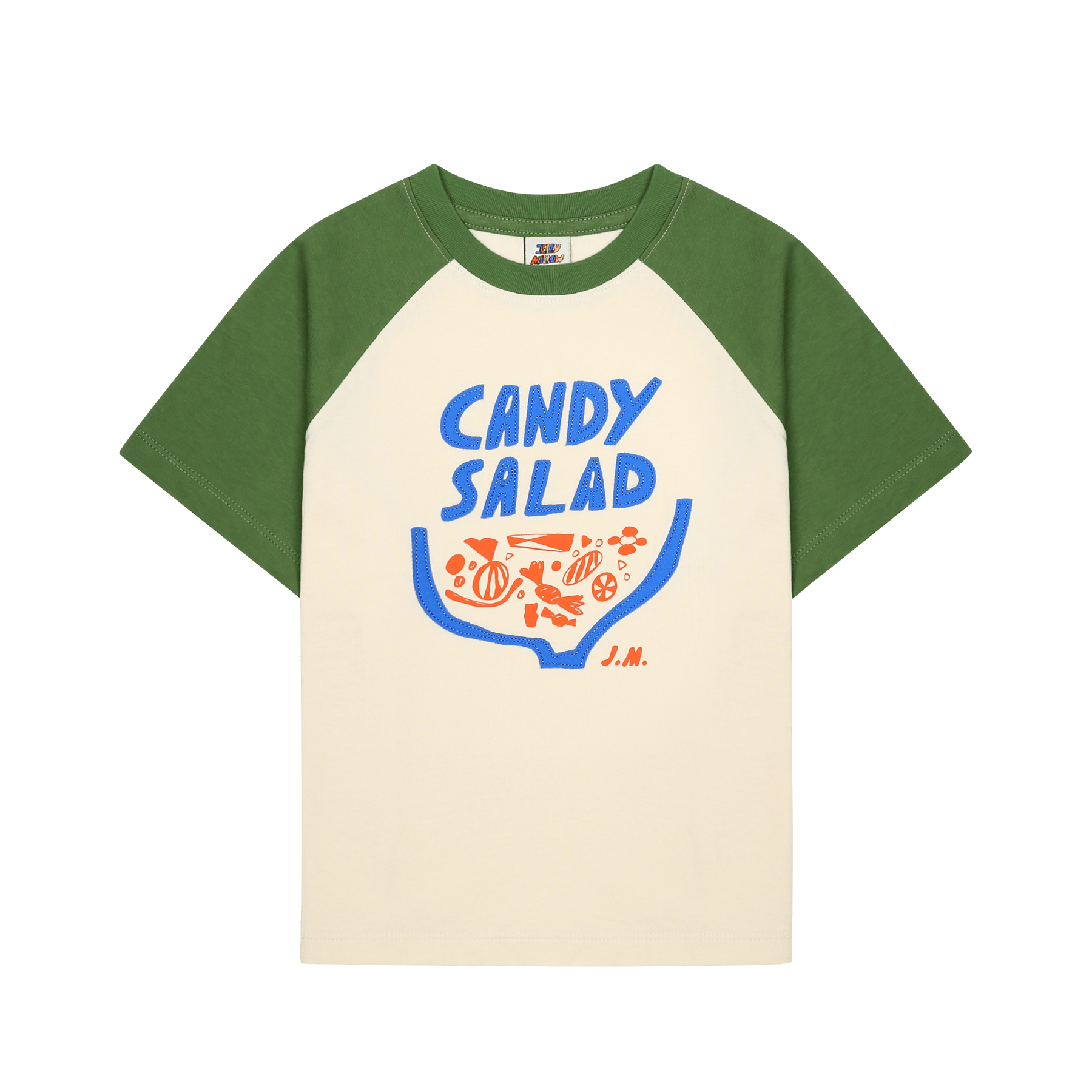 • Sweeten their everyday rotation with this Jelly Mallow raglan tee, featuring a whimsical "Candy Salad" graphic that is as fun as it is stylish. The cream-colored body provides a soft backdrop for the vibrant blue puff-print lettering and a bowl full of embroidered, multi-textured candy appliqués in bright orange. With its contrasting forest green sleeves and a comfortable ribbed crew neck, this play-ready top brings a tactile, 3D element to a classic sporty silhouette.