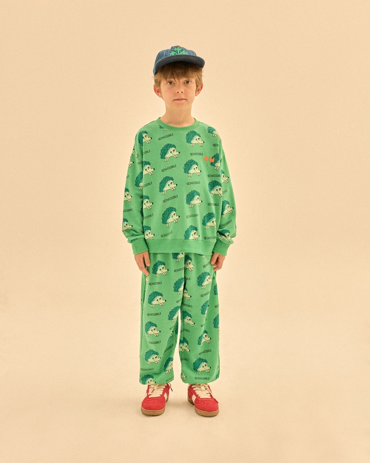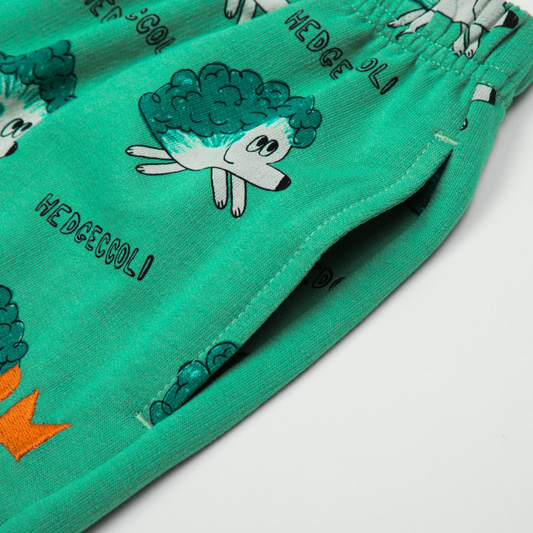• These Jelly Mallow Aladdin pants in a bright emerald green feature a playful all-over "Hedgeccoli" print, combining a cute hedgehog with a broccoli twist. Designed with a voluminous leg and elasticated cuffs, they provide a comfortable relaxed fit for active play. The trousers are finished with an elasticated waistband for an easy fit, a practical back patch pocket, and a small orange crown detail on the front.