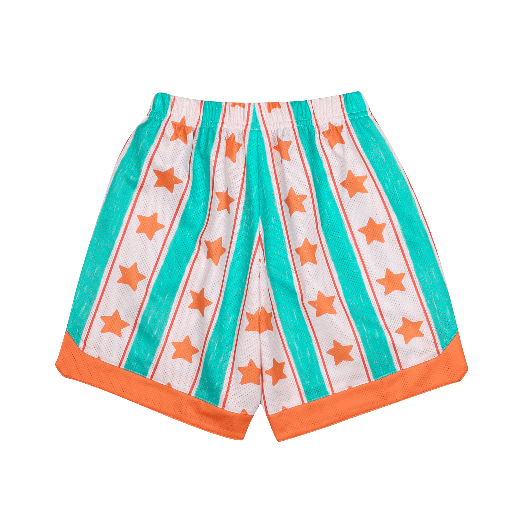 These Jelly Mallow mesh shorts bring sporty energy and playful charm together. Designed with breathable mesh fabric, they feature a vibrant star print mixed with bold vertical stripes for a standout look. The elastic waistband ensures a comfortable, easy fit, while the contrast hem adds a fun, athletic finish. Lightweight and airy, these shorts are perfect for active days, summer adventures, and kids who love bright, cheerful style.