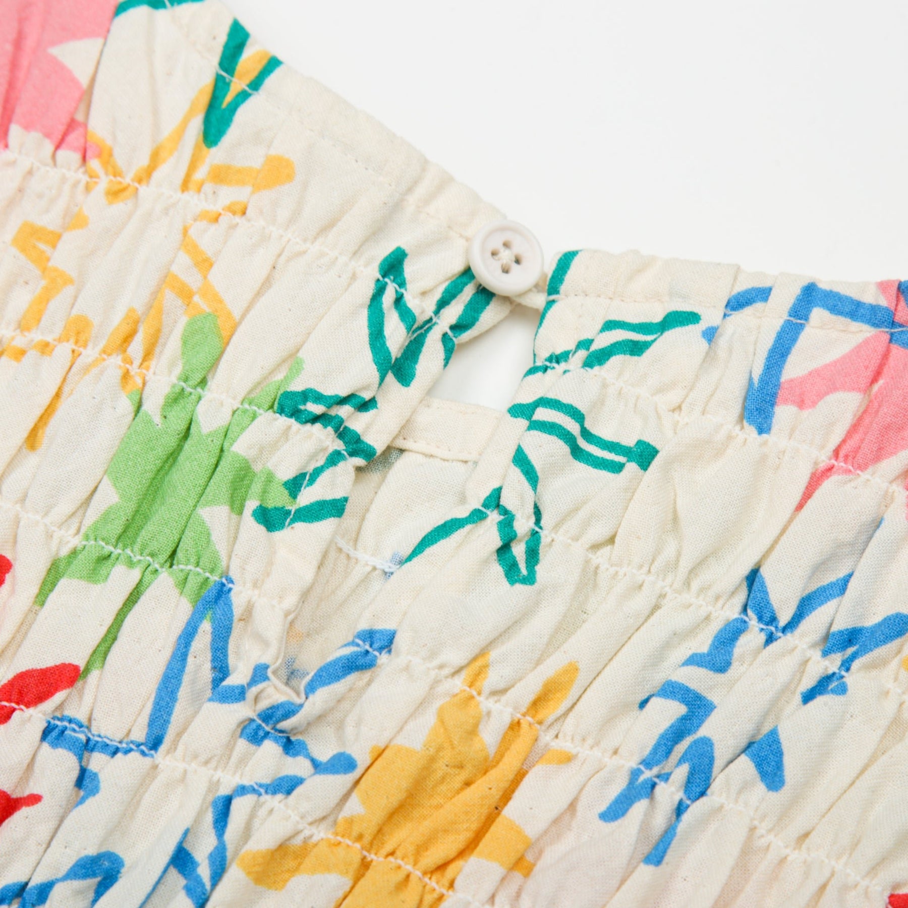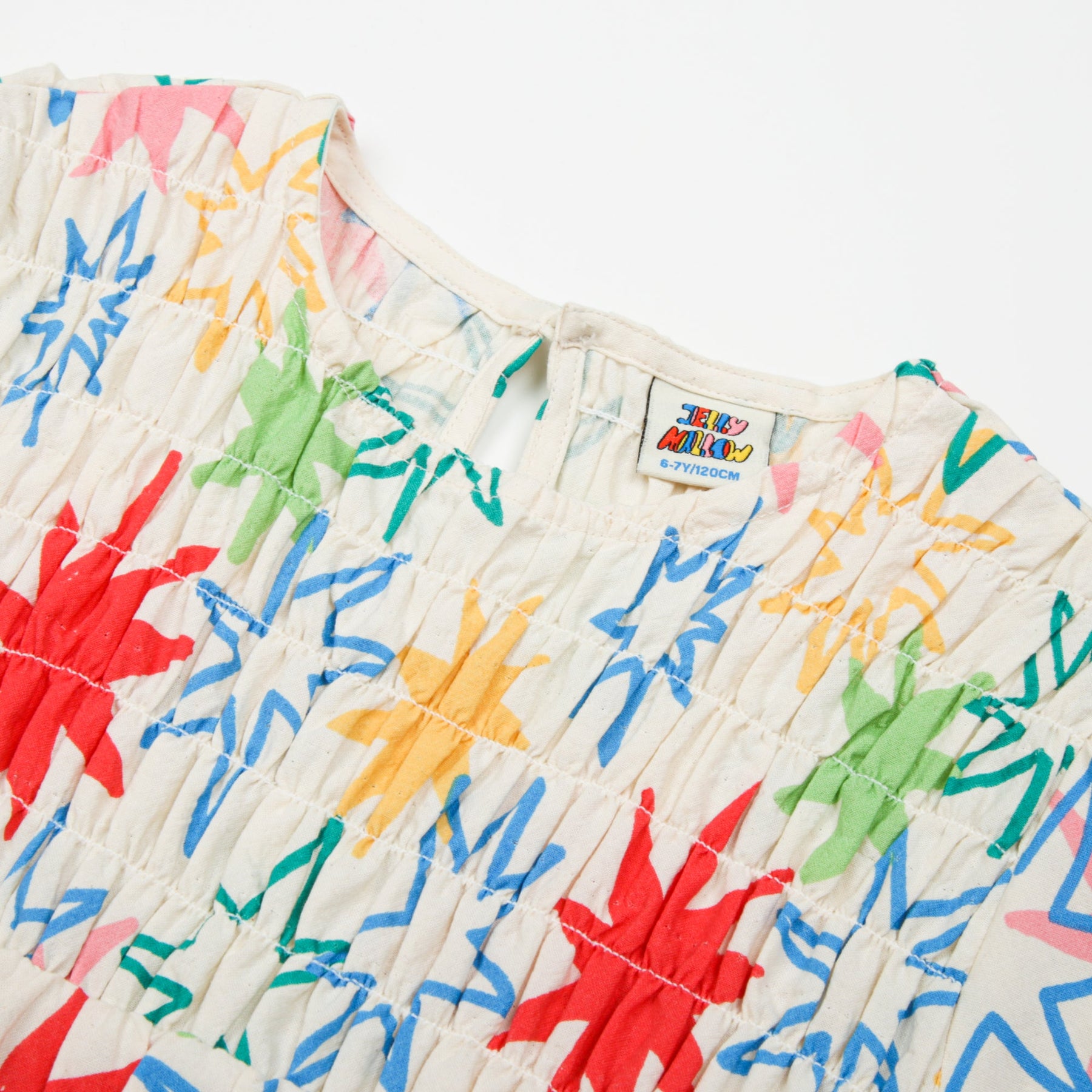 ThisJelly Mallow dress is a vibrant choice for summer, featuring an all-over multicoloured starburst print on a crisp white background. Designed with a textured, smocked bodice for a comfortable fit, it includes short puffed sleeves with ruffled elasticated cuffs and a tiered frill hem for a playful silhouette. A small keyhole button fastening at the back ensures easy dressing, making this soft cotton dress a perfect blend of style and practicality for sunny days.