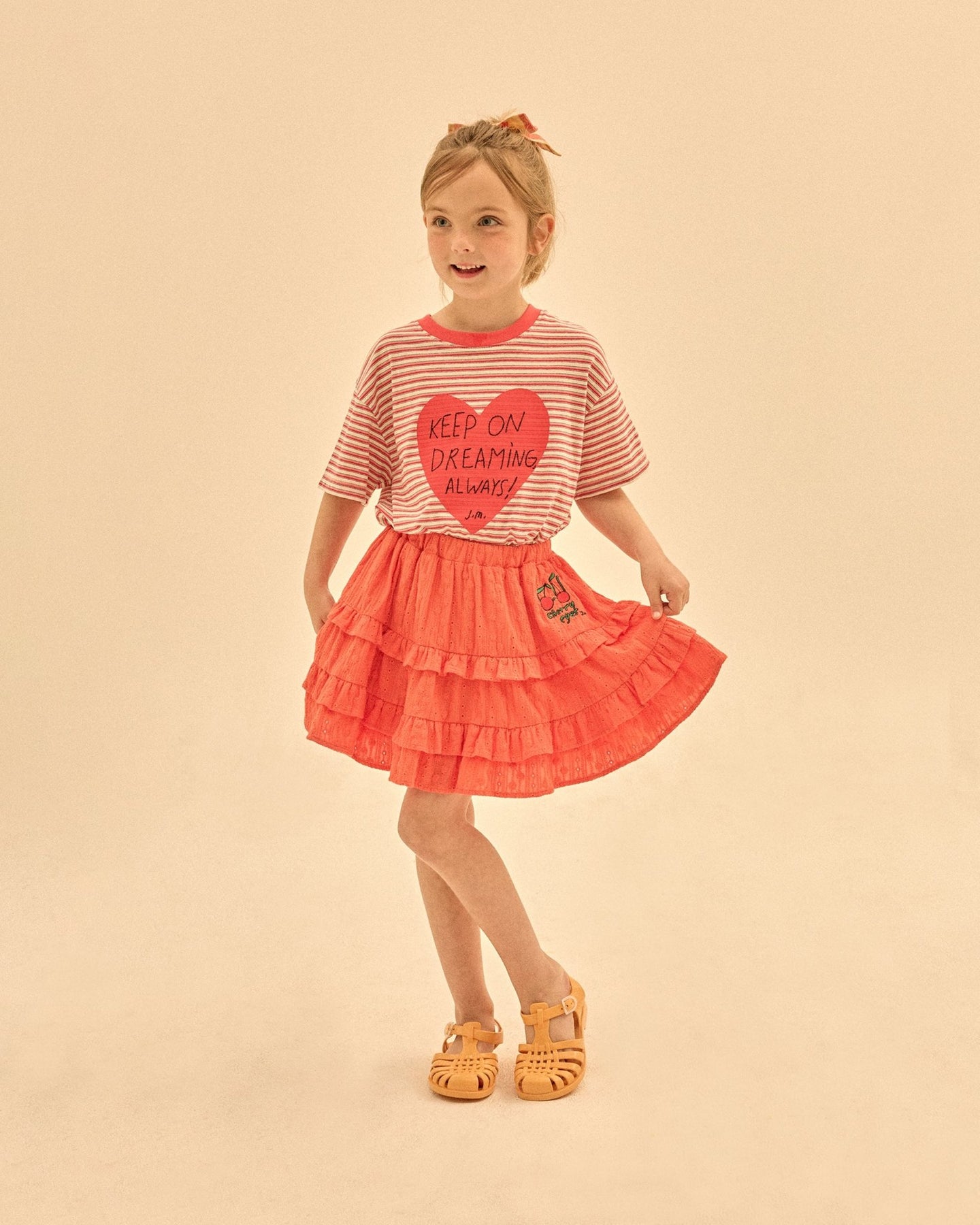 • This Jelly Mallow tee features a classic red and white horizontal stripe pattern for a timeless, nautical-inspired look. The front is centred with a bold, vibrant red heart graphic containing the handwritten-style inspirational message, "KEEP ON DREAMING ALWAYS!" and the signature "J.M." logo. Crafted with a comfortable red ribbed crew neck and a relaxed fit, this soft cotton t-shirt is perfect for adding a touch of positivity to their everyday style.