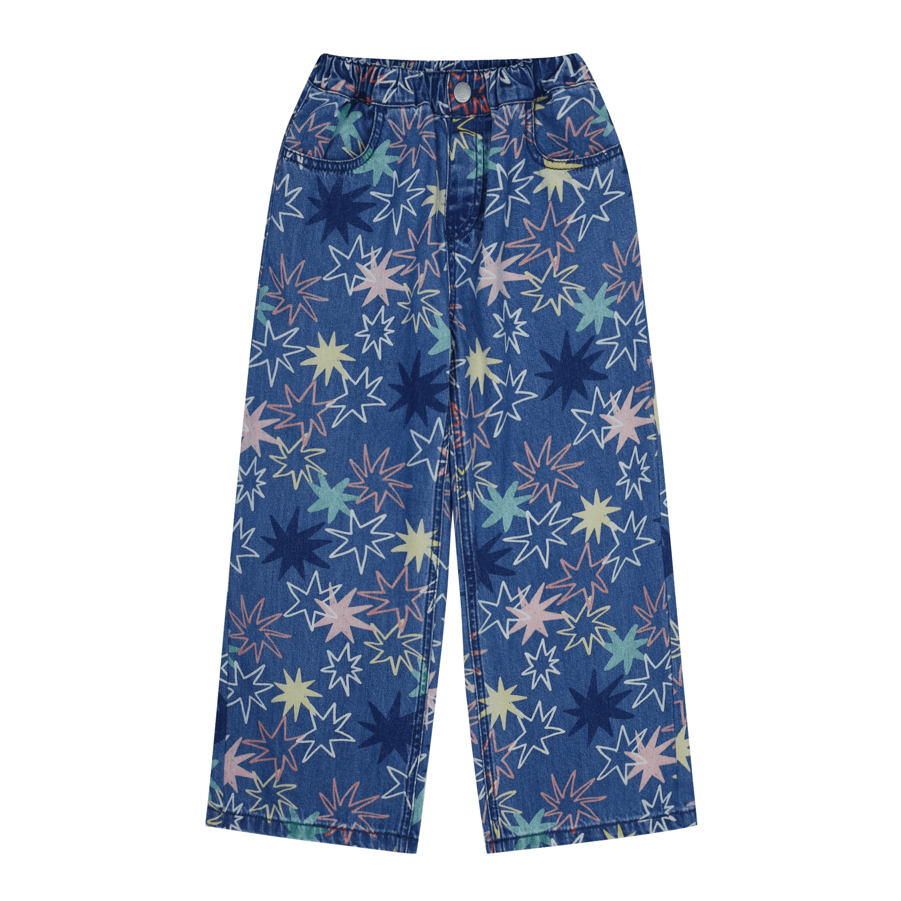 Playful meets practical in these standout denim pants. Made from soft, durable blue denim, they feature an all-over multicolour starburst print that adds a fun, eye-catching twist to a classic wide-leg silhouette. Designed with an elastic waistband for easy pull-on comfort, plus front and back pockets for everyday functionality. Perfect for kids who love bold style and freedom to move.