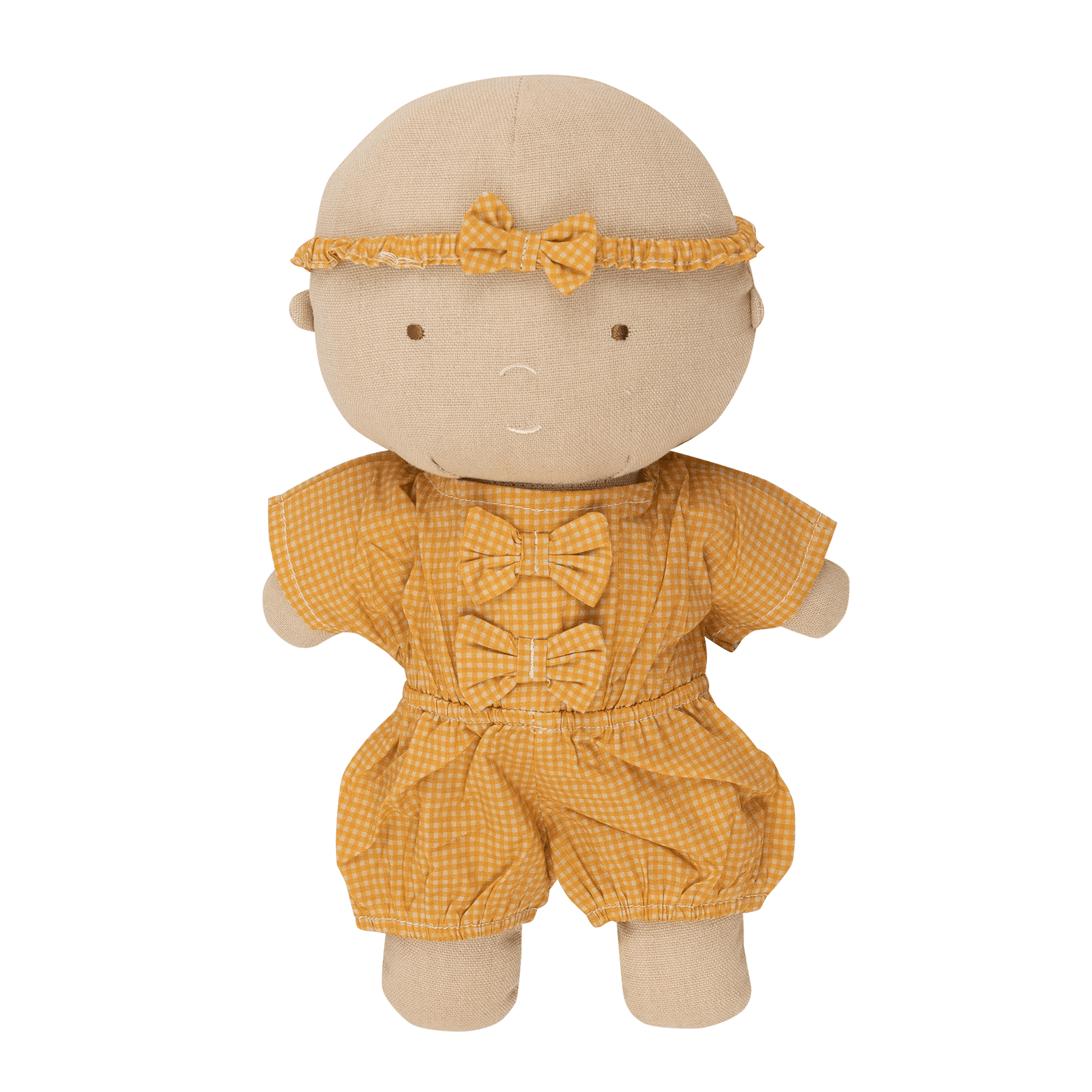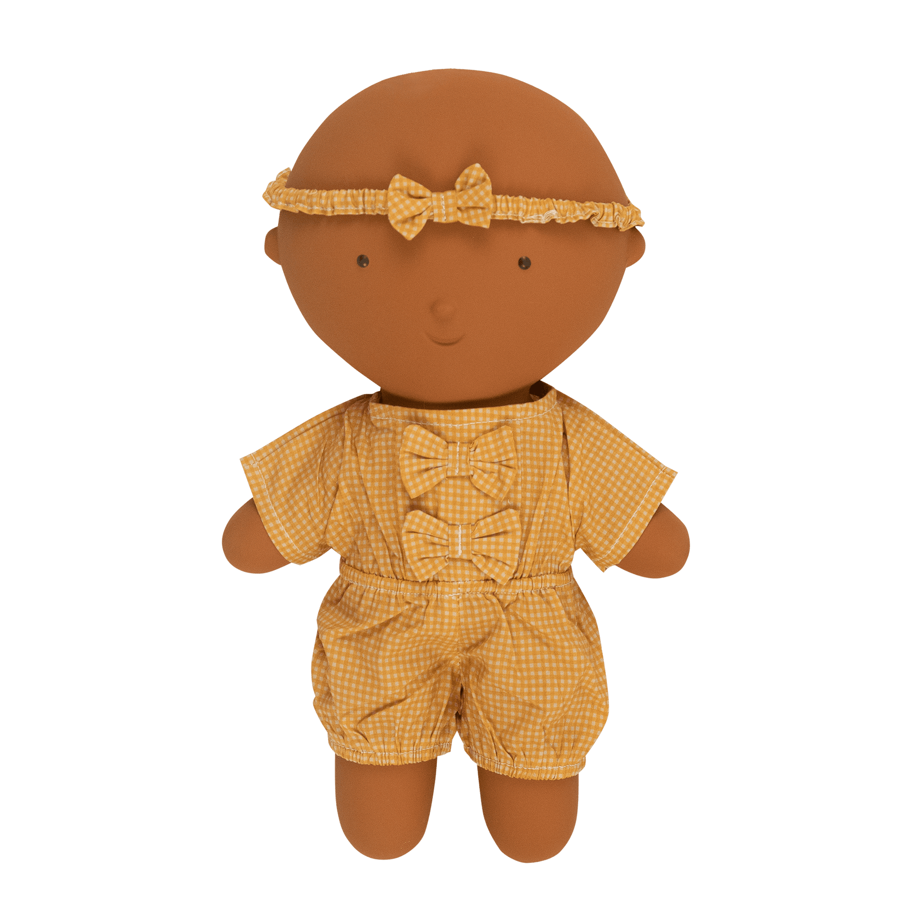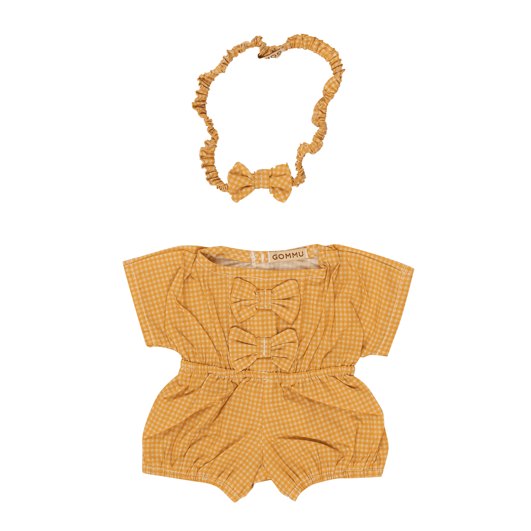 Give your GOMMU a stylish makeover with this adorable VICHY set! The soft poplin one-piece features a cute VICHY check pattern in cozy mustard and sand tones, combining comfort with vintage charm. Paired with a sweet bow tie, this outfit adds a fun and playful flair that's perfect for any occasion. Dress up your doll and let her shine with timeless style!